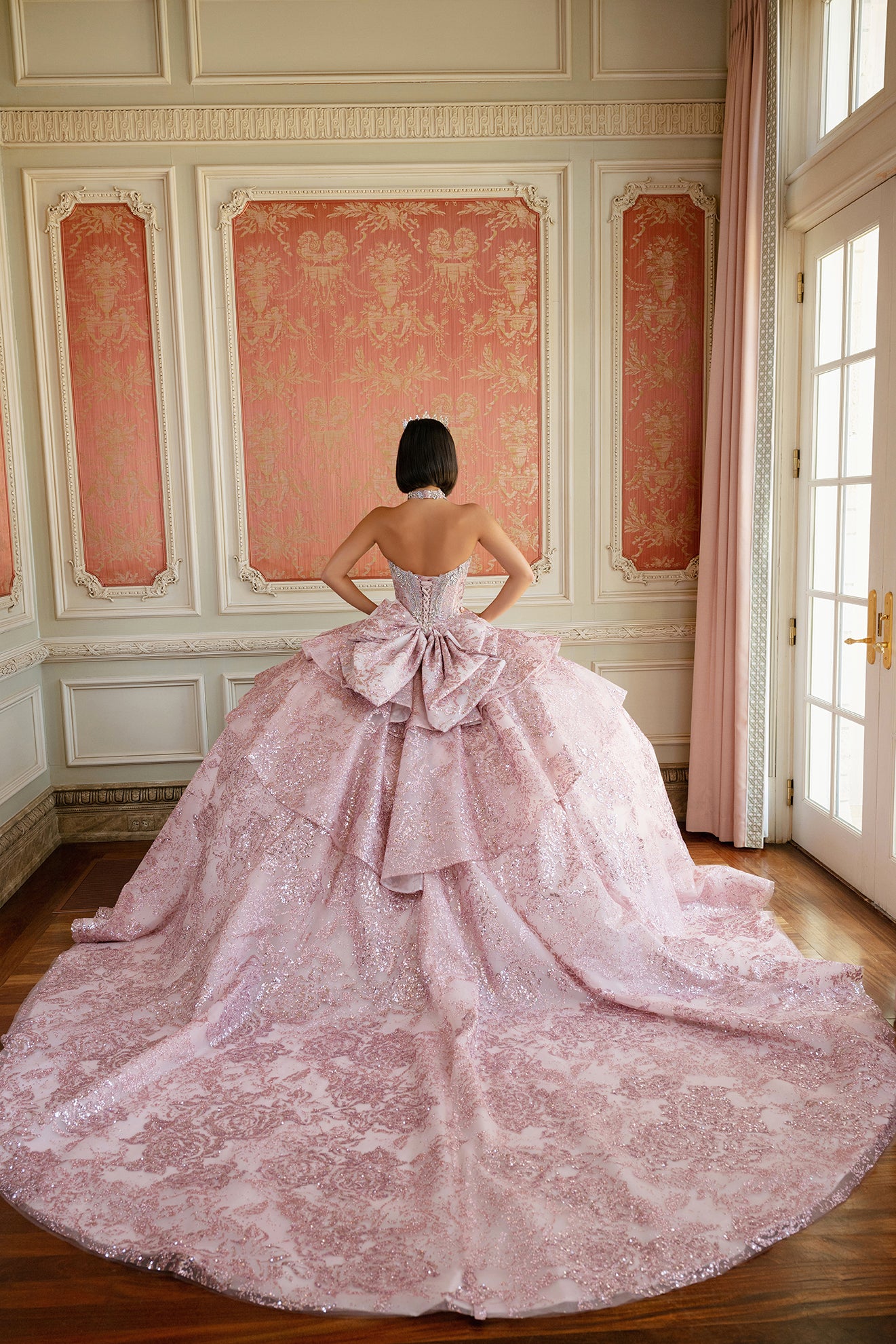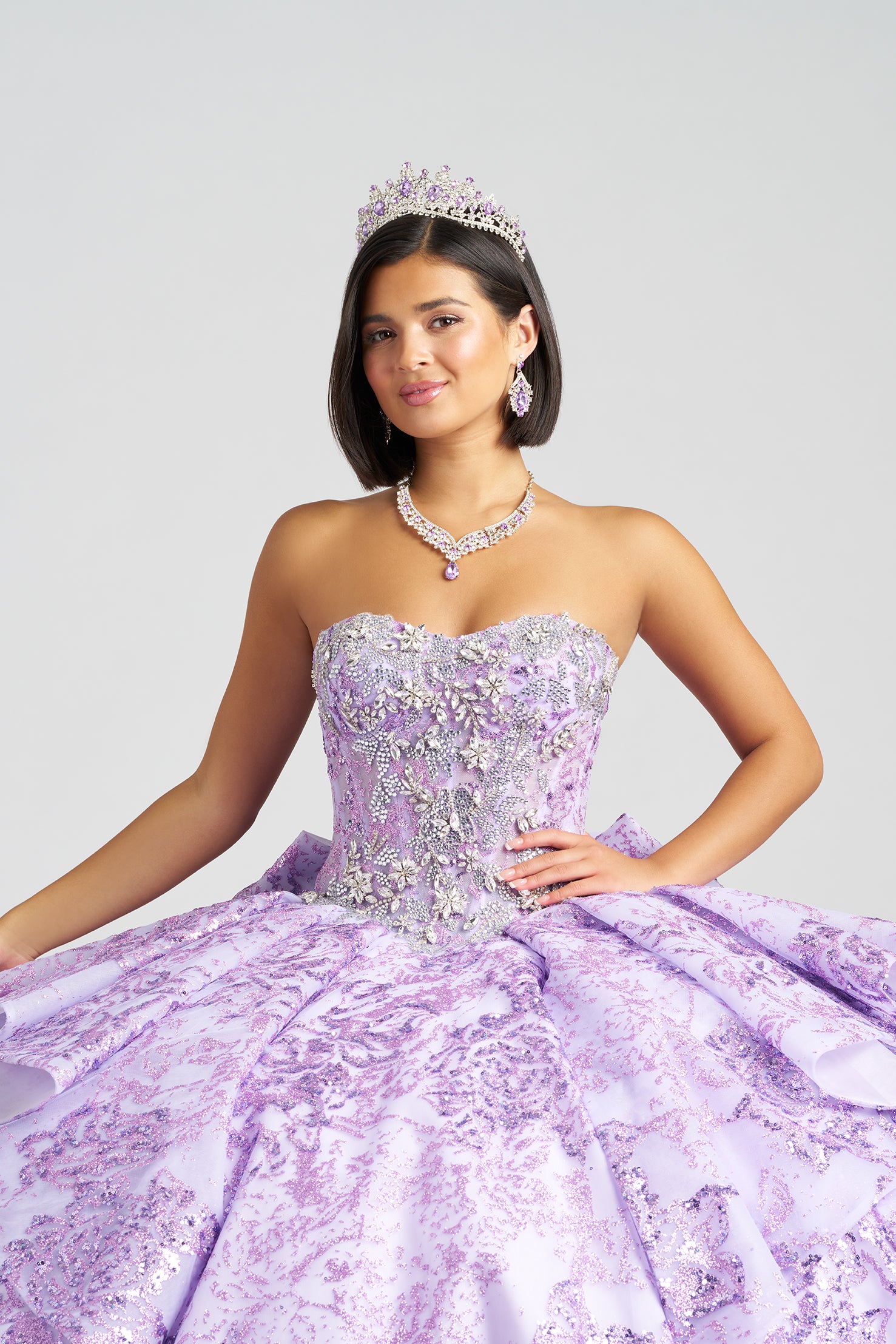 Radiant and regal, this crystal-beaded strapless ballgown sparkles with floral-patterned glitter tulle and a flattering basque waist. The tiered skirt flows into cascading layers down the back, finished with a detachable bow for a dramatic finale. A matching necklace completes the look with timeless charm.