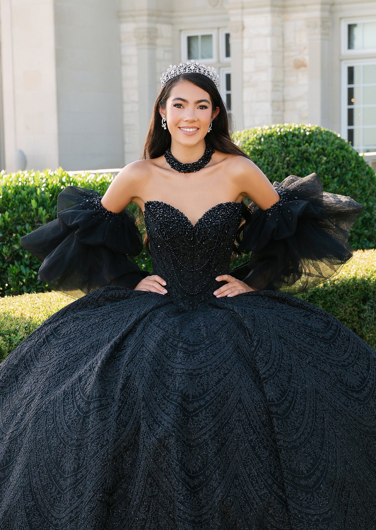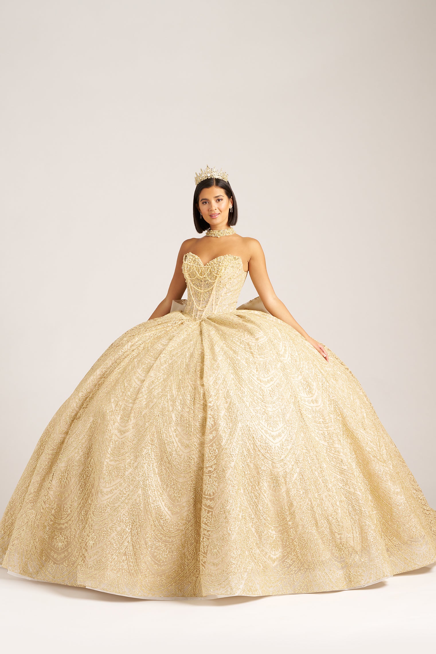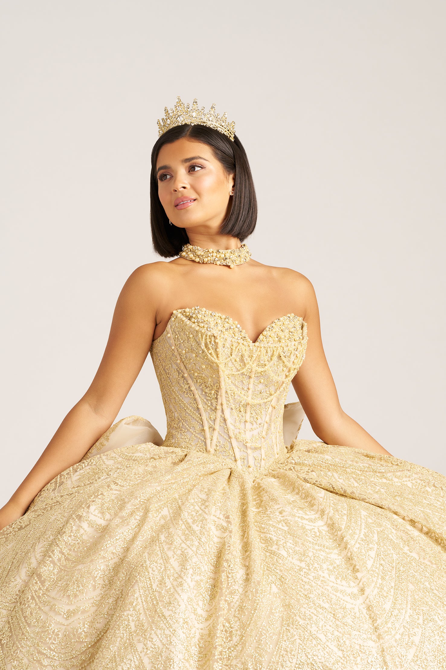 Regal and radiant, this strapless ballgown features chandelier-style beading that cascades across the bodice, creating a dazzling play of light. The sweetheart neckline and basque waist lead into a voluminous patterned glitter tulle skirt that shimmers with every step. Detachable puff sleeves and an oversized bow allow for versatile styling, while a matching necklace completes the look—an opulent design made for a grand celebration.