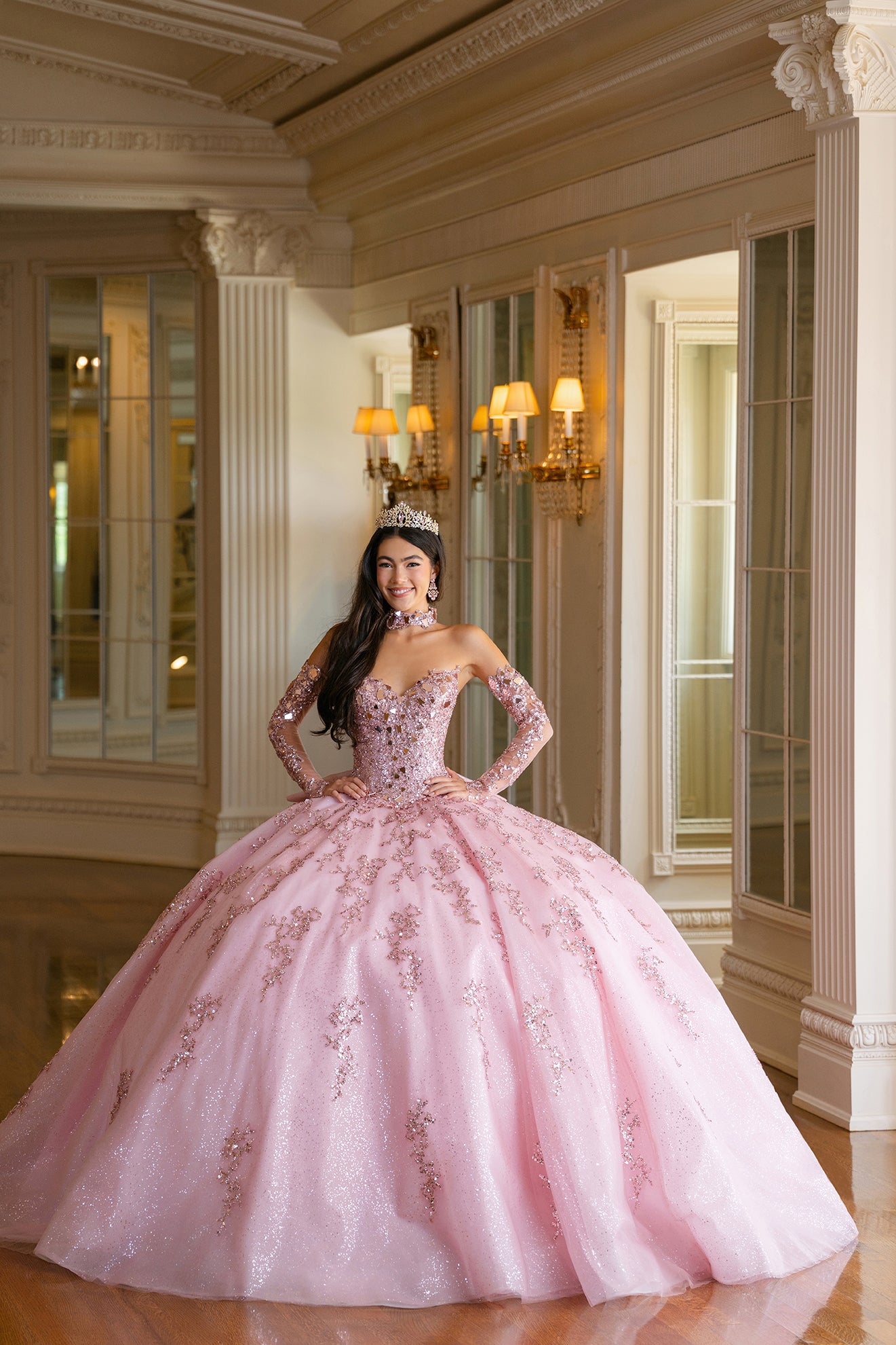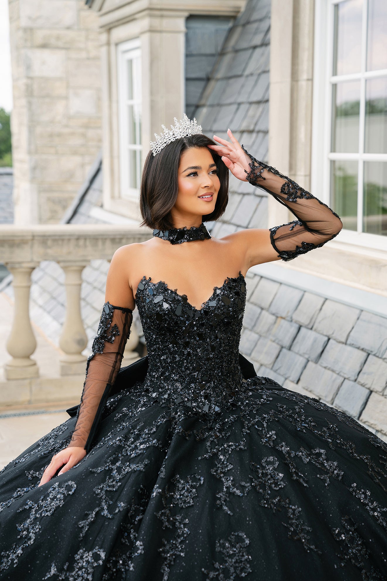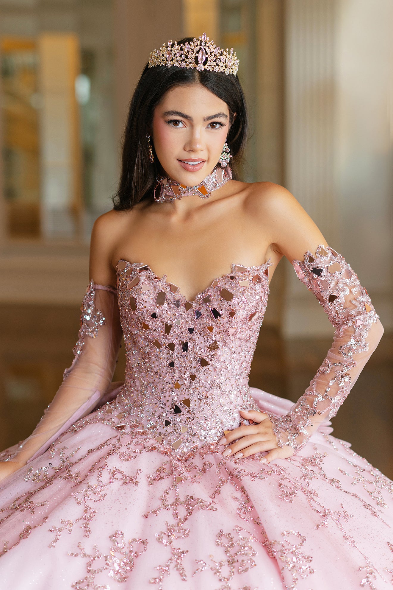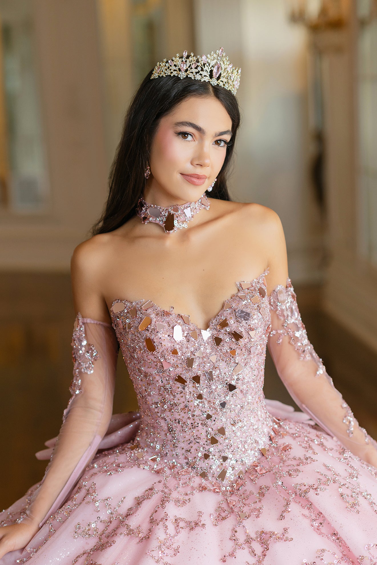 Designed to dazzle under every light, this color-mirrored beaded bodice shimmers with disco-ball brilliance above a full sparkle tulle skirt. Sequin and beaded appliques add depth and texture, while the sweetheart neckline and basque waist shape a flattering, sculpted silhouette. Detachable long sleeves, a matching necklace, and an oversized bow complete this radiant look—made for the spotlight.