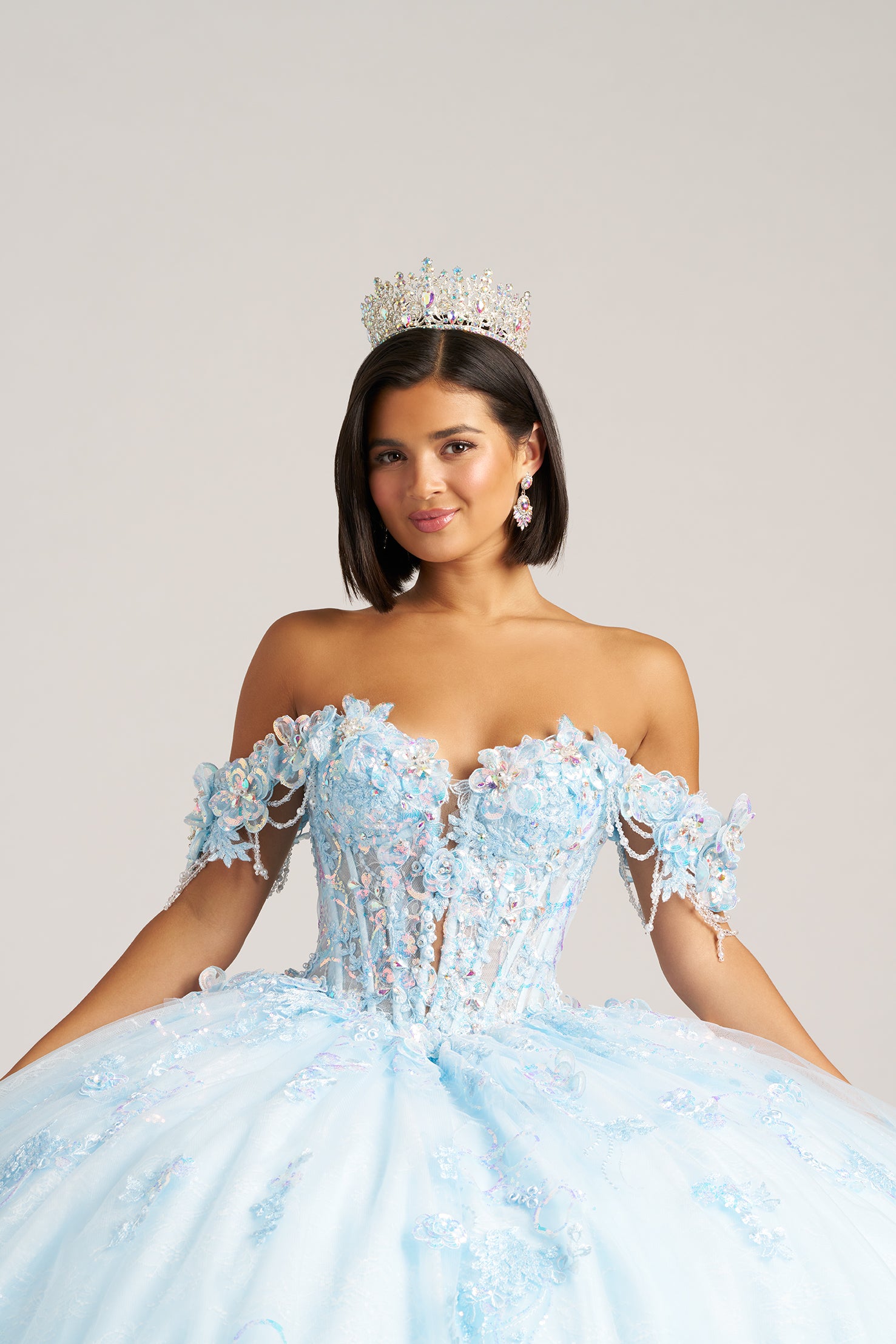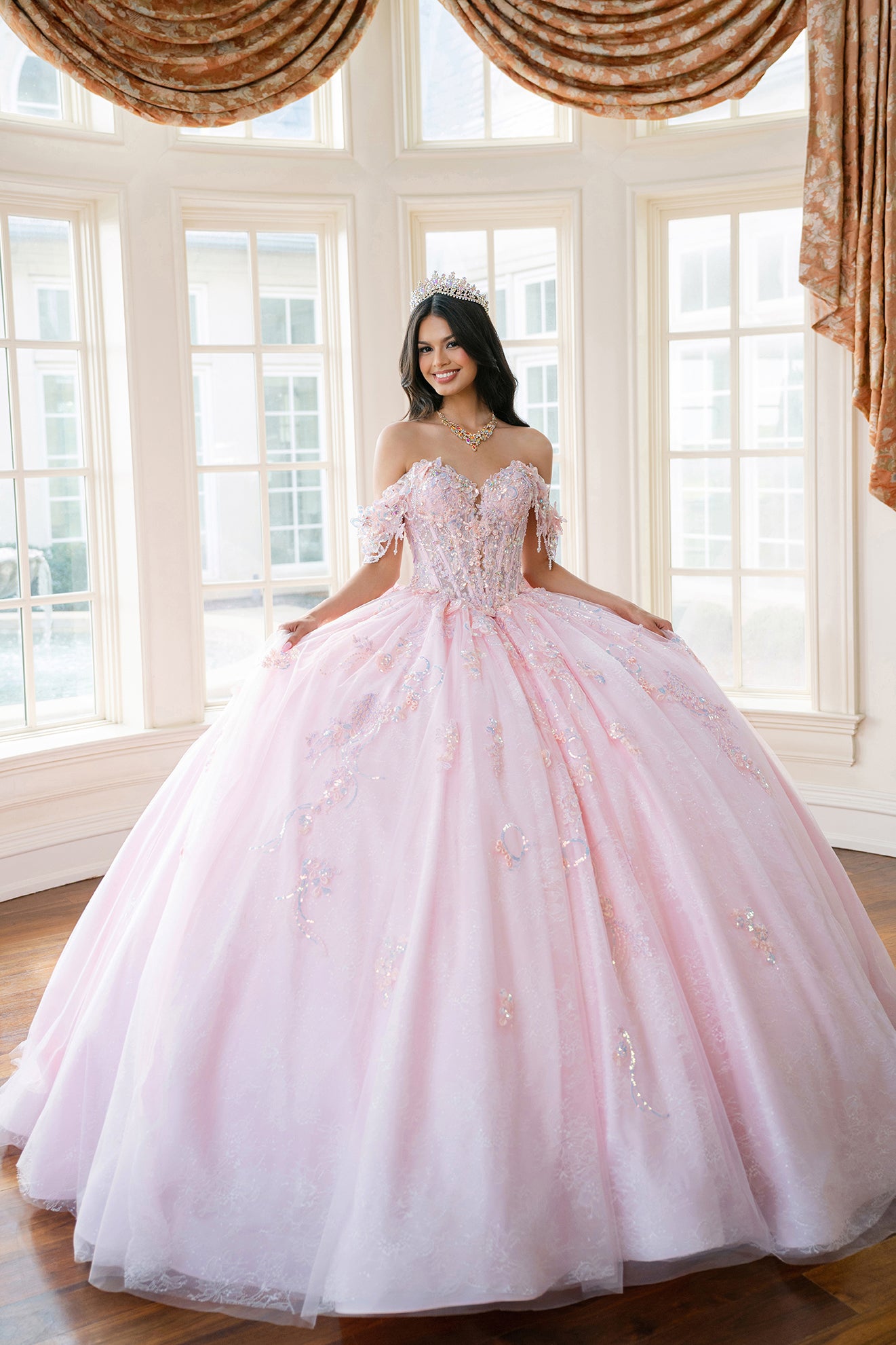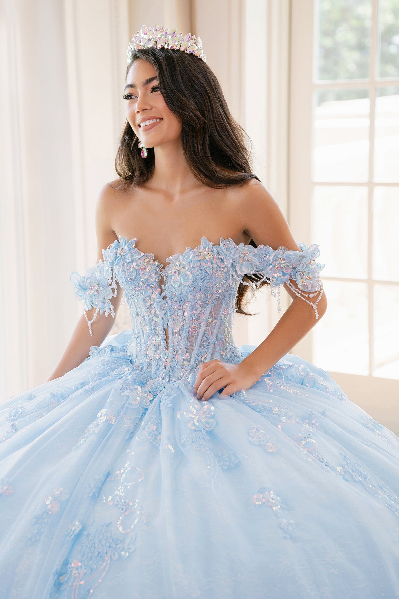 Softly radiant and full of fantasy, this off-shoulder ballgown sparkles with holographic sequins, dimensional lace appliques, and a richly beaded bodice. Draped strands of beading along the sleeves add a touch of movement and glamour, perfectly complementing the sweetheart neckline and basque waist. Crafted in layers of soft tulle, the gown is finished with a detachable bow, blending romantic charm with modern brilliance for an unforgettable celebration look.
