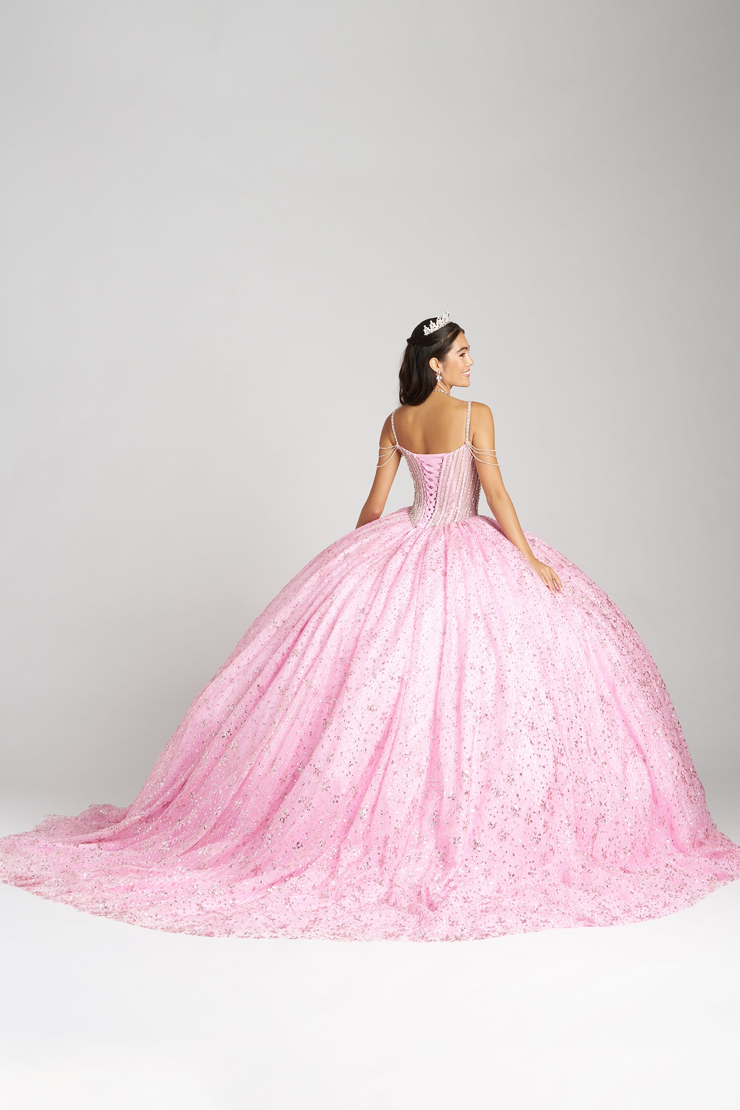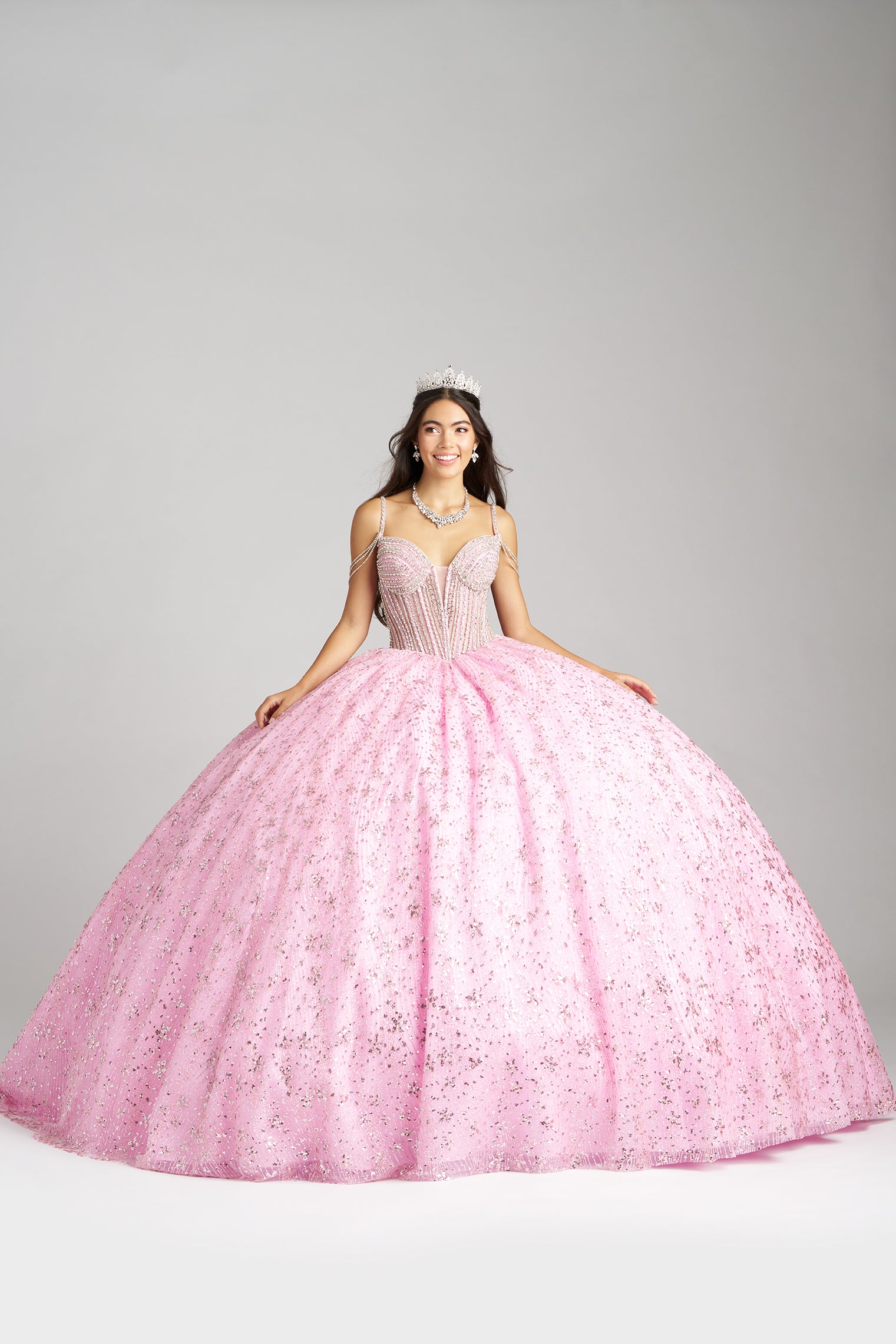 Linear beading accentuates the sweetheart bodice of this radiant ballgown, creating a sculpted, light-catching effect that draws the eye to the basque waist. The full skirt of patterned glitter tulle adds dimension and shine, while a detachable bow completes the look with playful drama. Available in Pink/Silver and Light Blue/Silver, this gown blends modern sparkle with classic Quinceañera elegance.