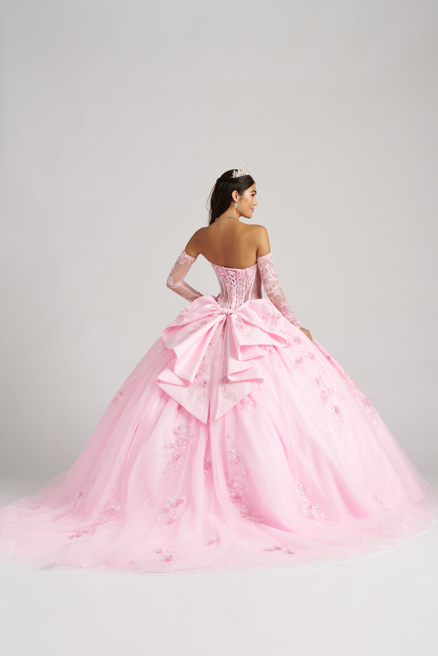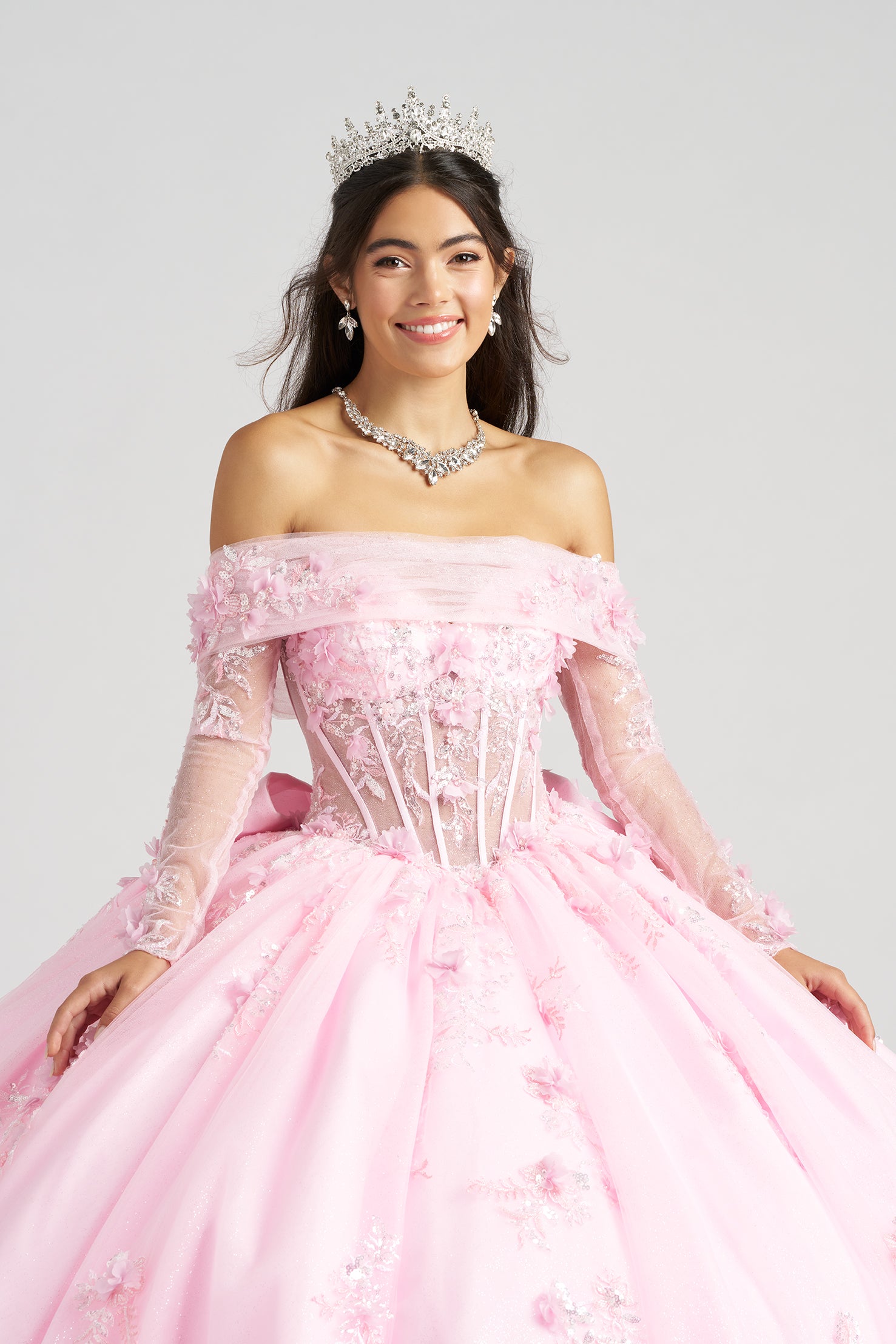 Shimmering with dimensional sequin lace appliques, this sweetheart ballgown captures the magic of celebration and sparkle. The fitted bodice and basque waist flow into a full glittering tulle skirt, creating a soft yet sculpted silhouette. Complete with a detachable shawl, long sleeves, and bow, this gown offers endless versatility for transforming your look throughout the night. Available in Pink and Baby Blue.