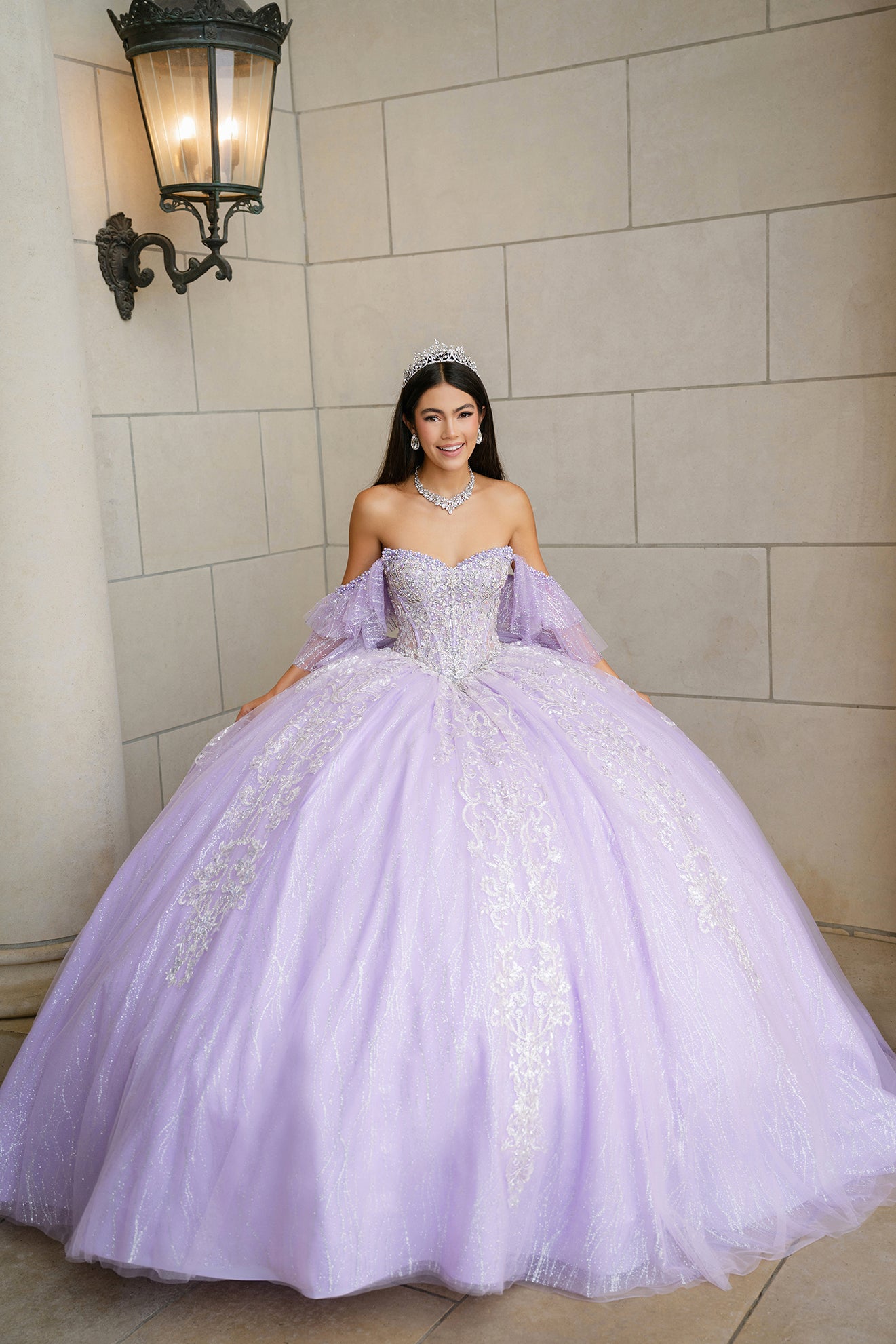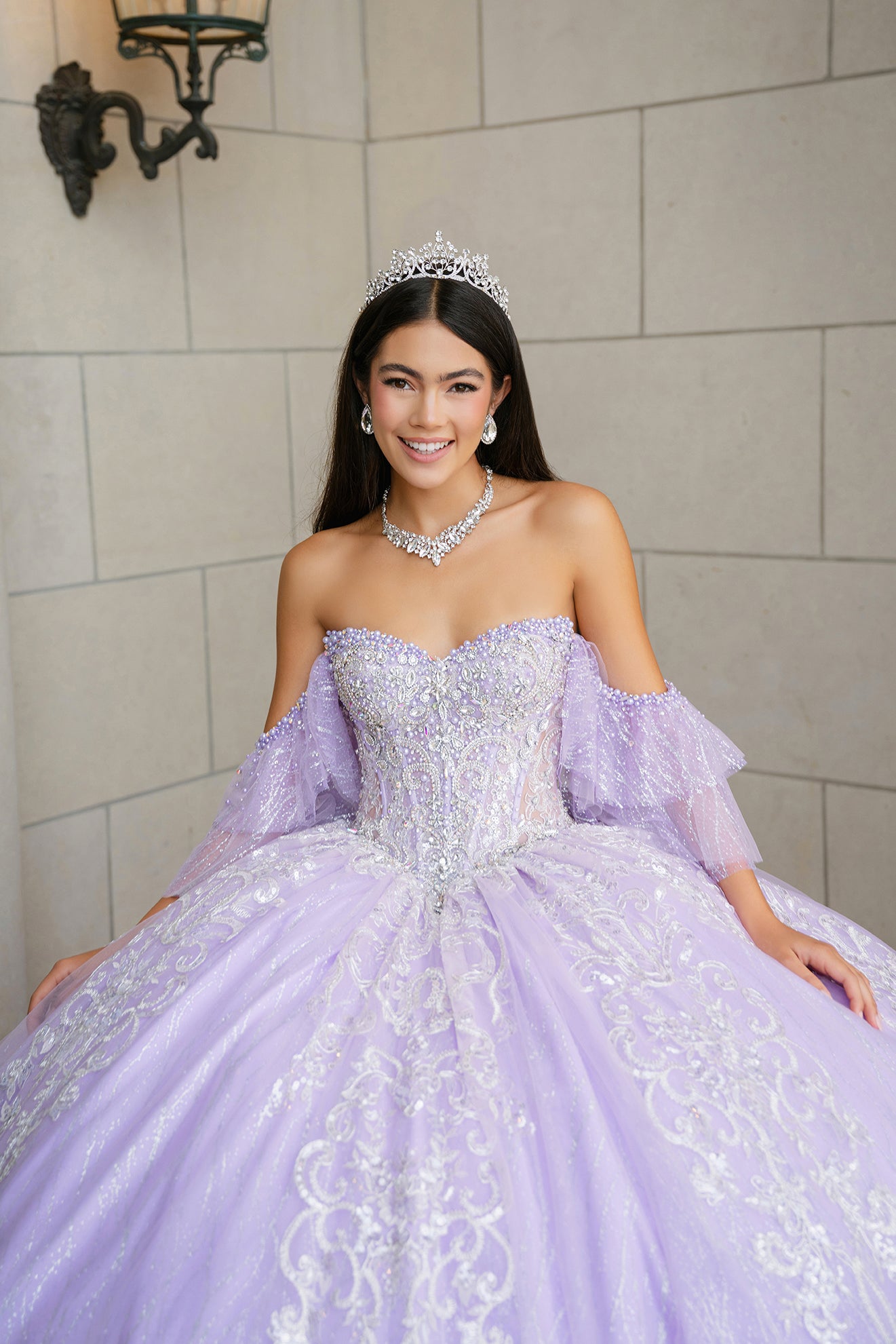 A beaded cateye bodice defines this radiant ballgown, featuring a sculpted basque waist and a full sparkle tulle skirt adorned with sequin-embroidered appliques. The detachable off-shoulder sleeves and bow add soft movement and versatility, allowing you to shift from regal ceremony to grand celebration with ease. Available in Light Blue/Silver and Lilac/Silver, this gown shines with elegance and modern charm.