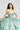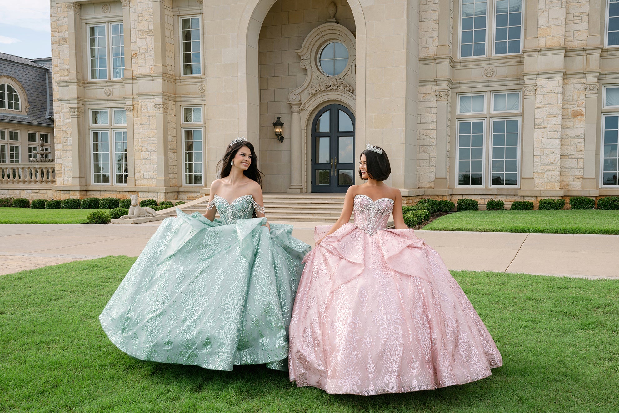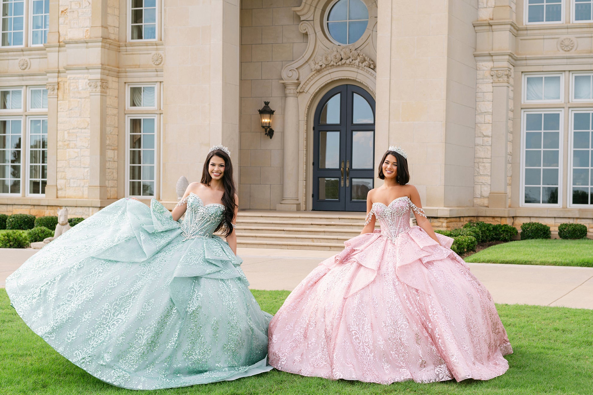 Dripping in crystals, this breathtaking ballgown features a beaded cateye bodice that flows into a sculpted basque waistline and cascading peplum. Patterned glitter tulle adds radiant dimension to the full skirt, while detachable crystal sleeves and a dramatic bow offer endless ways to personalize your look. Available in Sage and Blush, this gown is pure sparkle and sophistication.