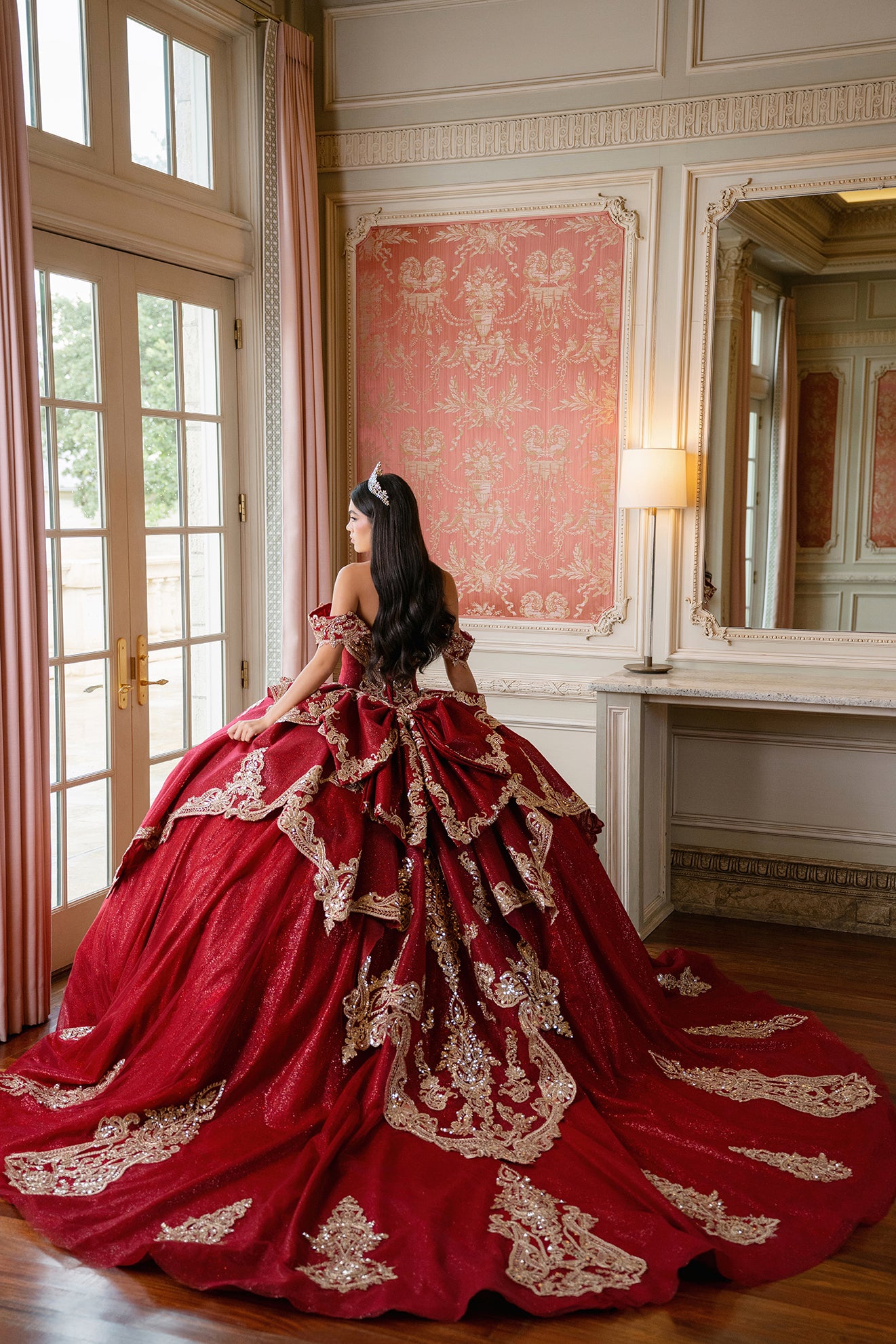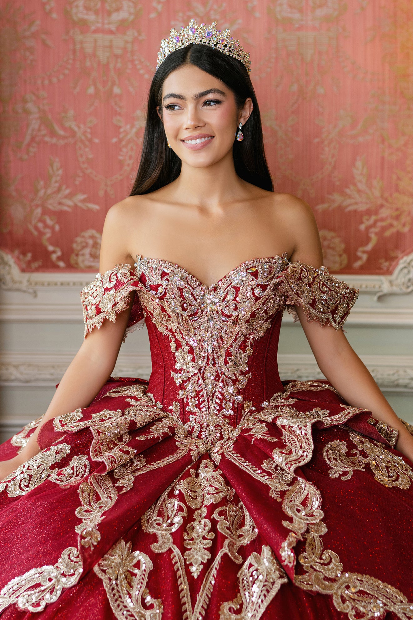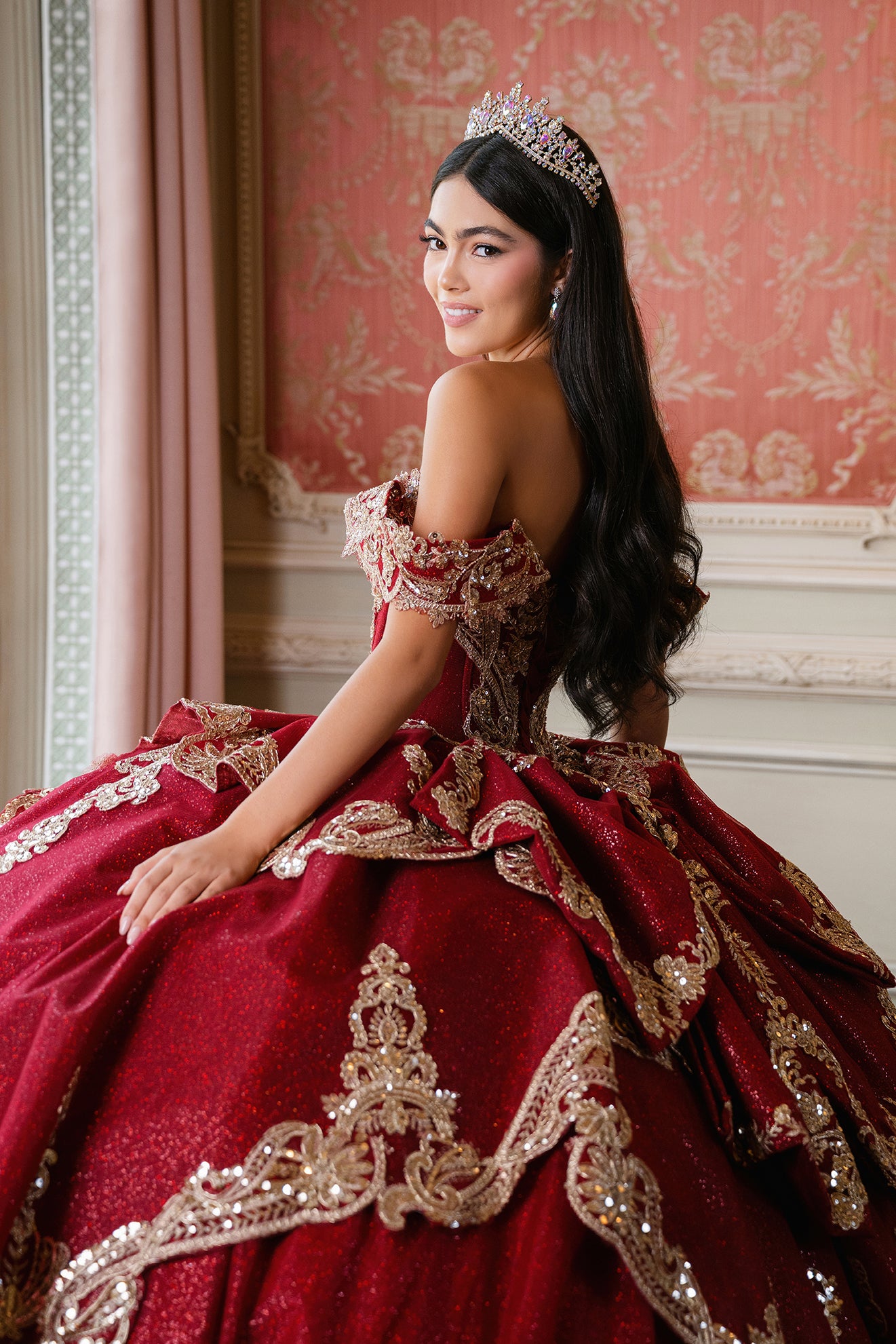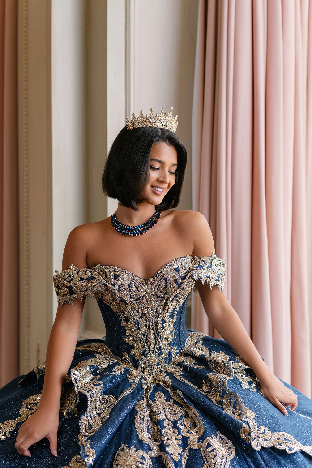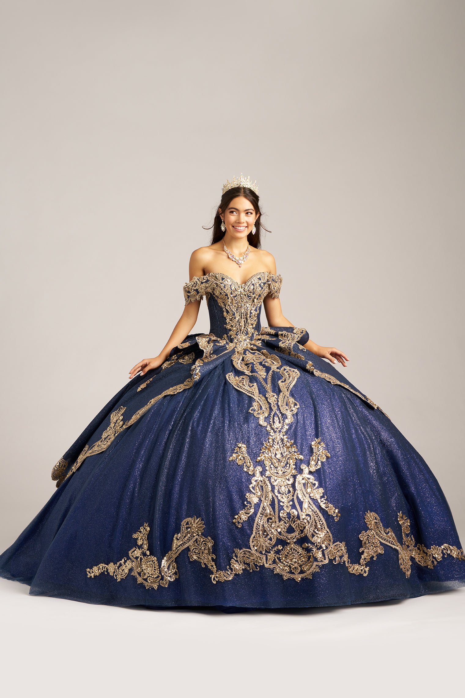 Shimmering sequin-embroidered appliques accent the sweetheart bodice of this radiant ballgown, flowing into a full sparkle tulle skirt. A soft peplum detail adds movement and shape at the waist, while a detachable bow finishes the look with dramatic flair. Designed in bold tones of Sangria Gold and Navy Gold, this gown captures the perfect mix of sophistication and celebration.